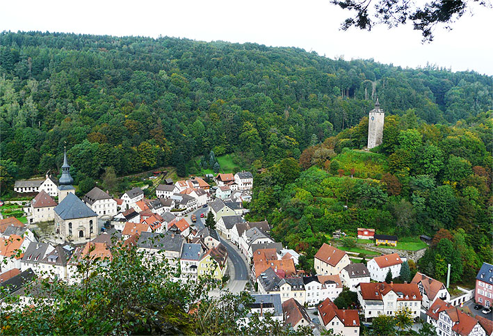 "Dicht vor Berneck wird man durch einen Anblick überrascht, der zu den schönsten gehört, die wir gehabt haben", schrieb der Dichter W.H.Wackenroder von seiner "Pfingstreise", die er 1793 mit Ludwig Tieck unternahm. Der malerisch von den steilen Hängen des Ölschnitztals gerahmte Ort verfügte einst über Bergwerke, in denen u.a.Gold, Silber und Blei gewonnen wurde. Erholungssuchende aller Art genießen die romantische Stimmung im Kurpark. Auf den Höhen liegen die Reste von vier Festungsanlagen, vom Gasthof Goldener Hirsch führt die Via Imperii zum Alten Schloss und zur Burg Hohenberneck.