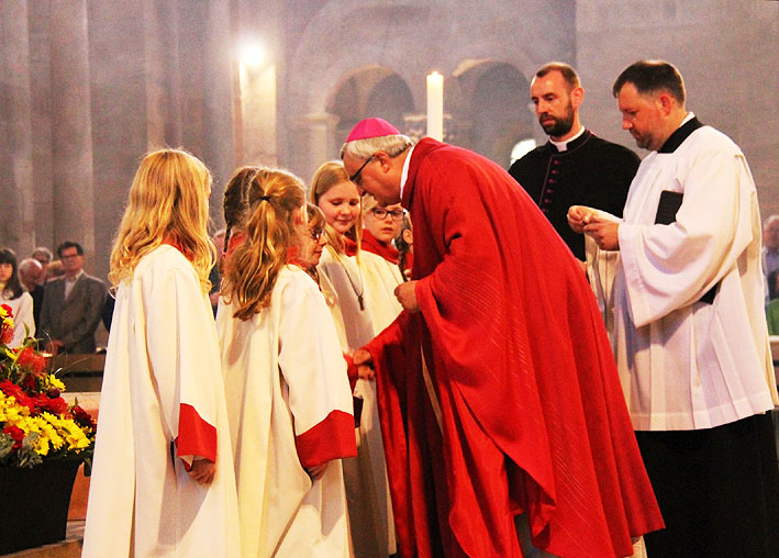 Im Rahmen des Gottesdienstes wurden 17 junge Sängerinnen in den Mädchenchor der Dommusik aufgenommen. Bischof Wiesemann segnete und übergab ihnen die Chorkreuze, die sie bei den Gottesdiensten im Dom künftig tragen werden. Er dankte ihnen für ihren Entschluss, dass sie mit ihrer Stimme "dazu beitragen wollen, dass das Gotteslob sich verbreitet". Musikalisch gestaltet wurde der Gottesdienst vom Mädchenchor, dem Domchor und einigen Instrumentalisten unter der Leitung von Domkapellmeister Markus Melchiori. Die Orgel spielte Domorganist Markus Eichenlaub. Die Musiker brachten unter anderem die "Missa in D" von Johann Georg Albrechtsberger zu Gehör.